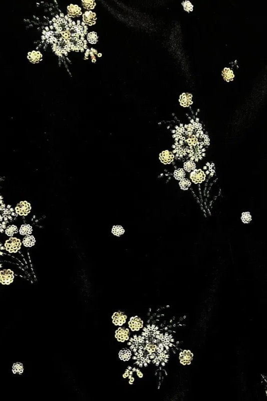 The Camila Dress is a long velvet gown, richly adorned with intricate beading that exudes effortless glamour. Adjustable tie straps make fit more versatile, adding a romantic and refined finish that’s perfect for evening occasions.