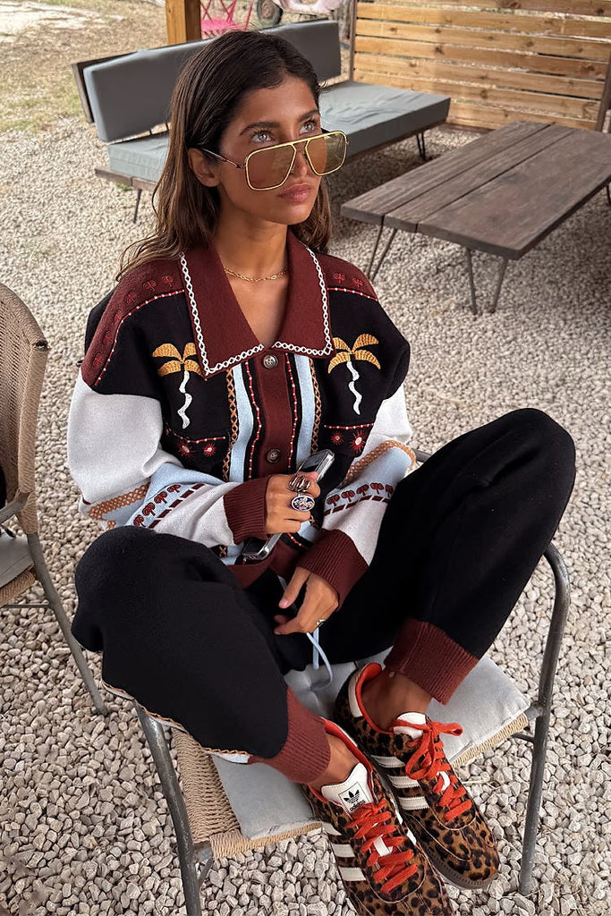 A light throw over for when it gets chilly in the evenings, with the thicker ribbed hems and a collar making it a slightly more structured silhouette. The knitted fabric is so soft to the touch and feels weighty to drape the frame nicely. In a range of autumnal tones with intricate details such as the blanket stitch trim and our iconic palm motif embroidered throughout. Pair with the matching joggers for an effortlessly chic day to night outfit!