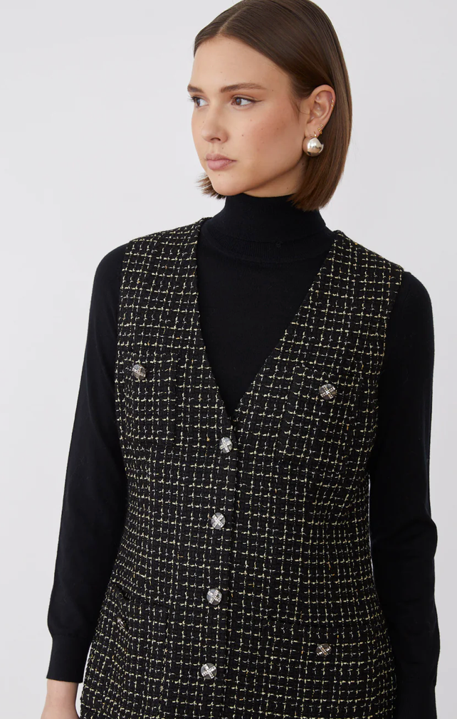 The INDRA JACKET is a sleeveless piece crafted in a classic long tweed style, offering a refined silhouette. Its carefully embellished buttons add a touch of elegance, making it perfect for layering over sophisticated ensembles. This jacket elevates your wardrobe with timeless texture and subtle decorative details.