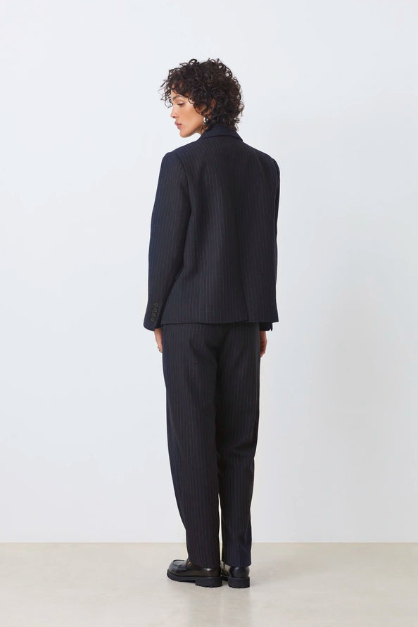 -Striped blazer jacket -Shoulder pads -Front buttoned closing -Two flap patch pockets on the sides -Made from recycled polyester and recycled wool For a total look, match Diam jacket with Jacob pants.