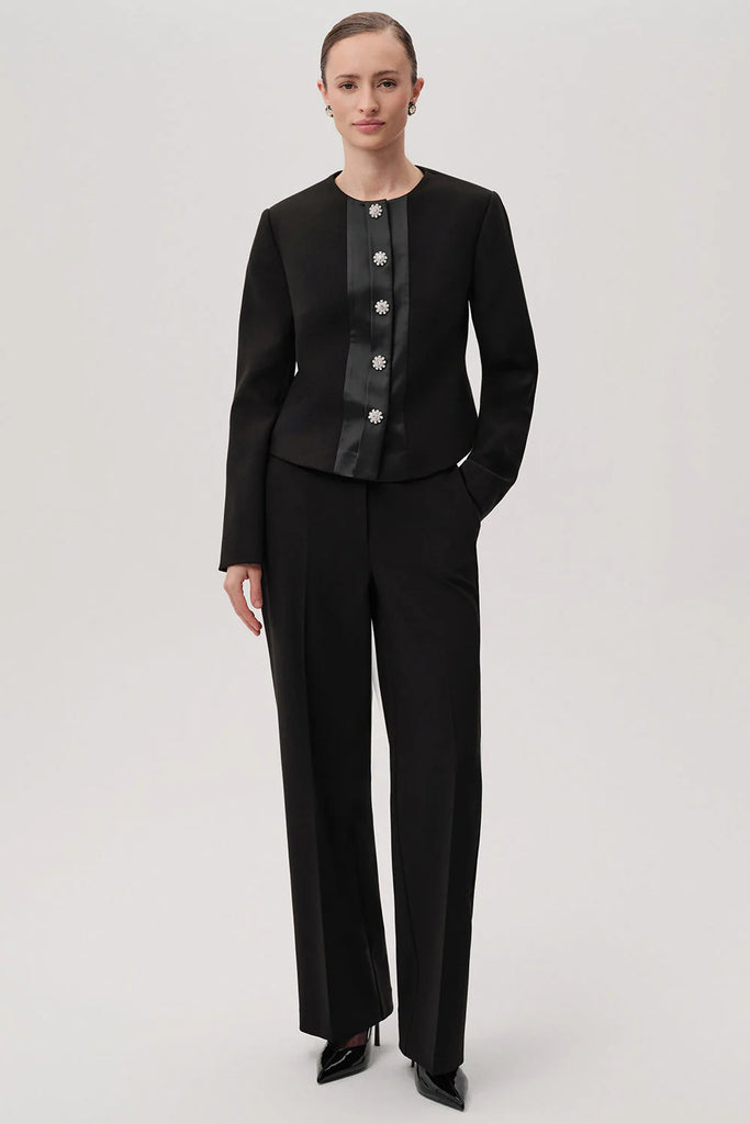 The Aster Jacket is defined by a sculptural high neck and sculpted seaming. Crafted in a stretch-blend black fabric with a soft sheen, this long-sleeve silhouette balances femininity with tailored edge.