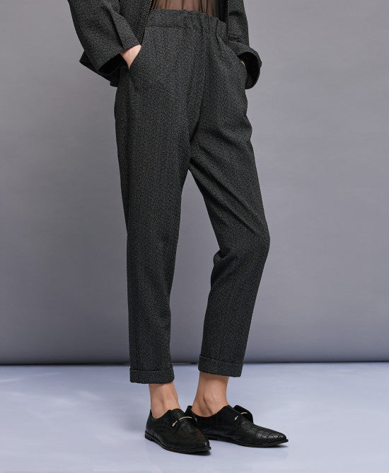 High-waist pants with rhinestone details and turn-up hems. They feature an elastic waistband and side pockets. Pair it with the matching blouse from our collection for impressive and comfortable looks.