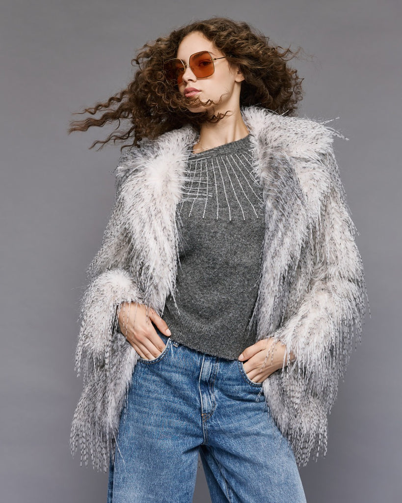 Long-hair faux fur coat featuring a notched lapel collar and side pockets. Designed with front hook-and-eye fastening and inner lining. A perfect choice for elegant formal looks.