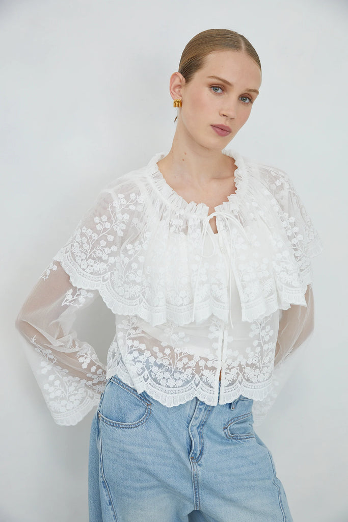 The Cassis Blouse epitomises understated refinement with its sheer fabric and delicate lace embroidery. A graceful tie neckline adds an element of gentle femininity, while the intricate detailing creates visual interest without overwhelming the design. Perfect for layering or wearing as a standalone piece, this blouse strikes the ideal balance between simplicity and sophistication, making it an essential addition to any discerning wardrobe.